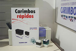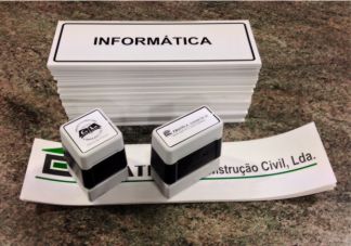 Personalizamos carimbos. Carimbos auto-tintados personalizados na hora, disponíveis em preto, azul, vermelho e verde, nas seguintes dimensões: 10x60mm, 12x12mm, 14x38mm, 18x50mm, 20x20mm, 22x60mm, 27x70mm, 30x30mm, 34x58mm, 40x40mm, 40x90mm. (Alguns tamanhos e/ou cores de carimbos estão sujeitos a encomenda prévia). Poderá fazer carimbos com letras ou imagens / logótipos.